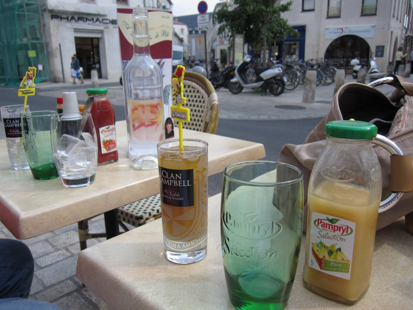 A moment in France, frozen. One Bloody Mary for Ramona and a rum and pear juice for me…on a street, mid-afternoon, no stress, no schedule, no problem.
