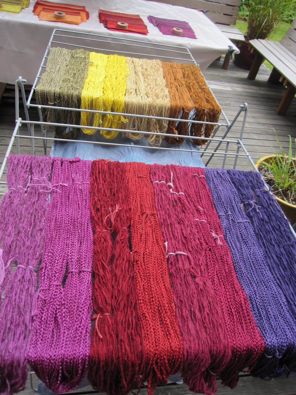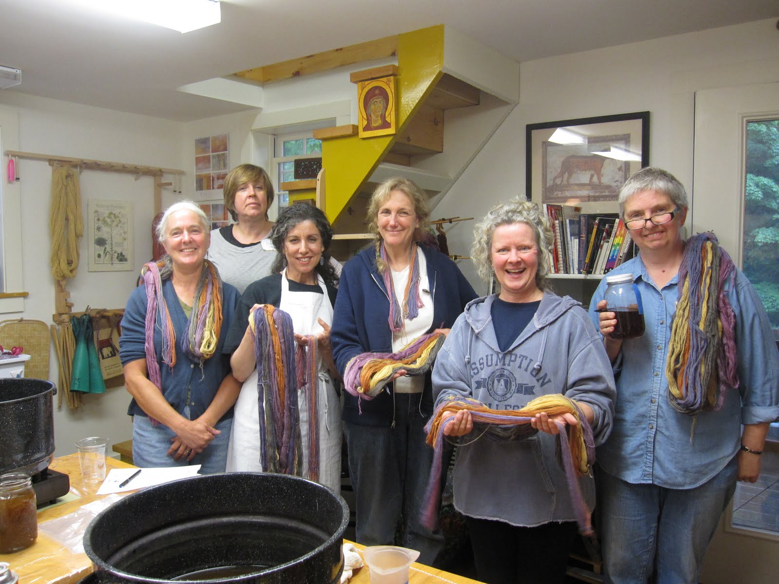 Backing up a few weeks, I taught Basics in Natural Dyeing, here at the farm to a great group of students on June 12th working through the steps to become a successful dyer using Earthues natural dyes. I was full of enthusiasm after returning from France. After a brief lecture we jumped into dyeing two colors from one dyepot. I set up the day so each student would go home with 8 dye formulations with yarn samples to build from for their own personal work.