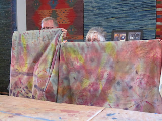 and worked through some basic but stunning dyes on two yummy substrates, did some handpainting on shibori scarves, did overdyeing with woad and spent considerable time on current trend colors and their relationships on fabric and yarn.