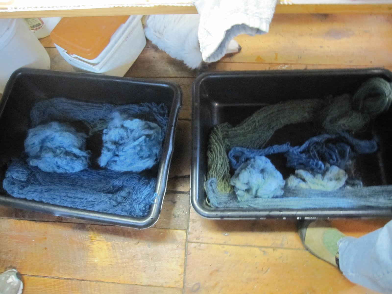 Helen is building her layers of indigo to some beautiful yarns she spun. Indigo dyeing works on the concept of building the blue through multiple dips until the prefered blue hue is acheived.