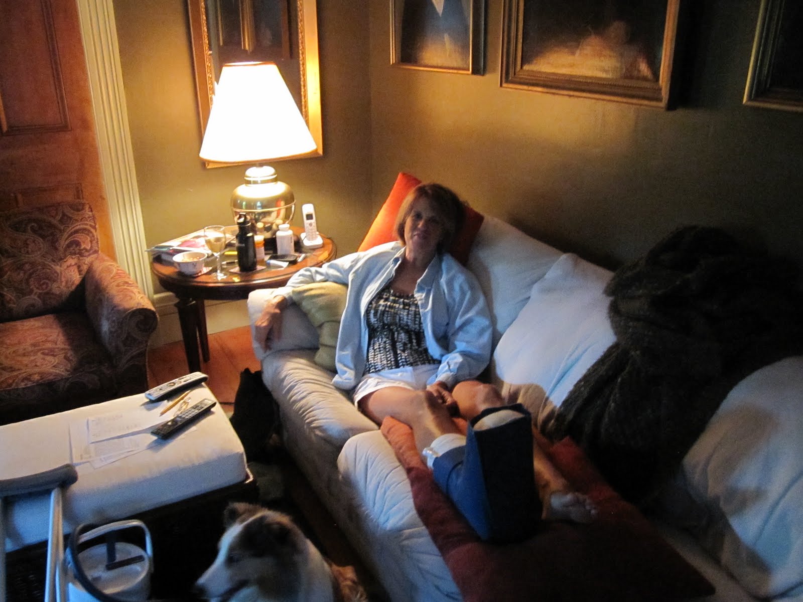 Recovery is treacherous, cruel and oh, so boring! Here is my existence to some degree. I mean from here I travel on crutches to the bathroom, the bedroom and the kitchen. I have a spot in the kitchen at the island where I can elevate the foot and at least converse with Jack during meals.