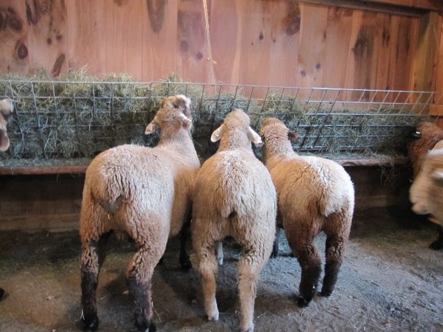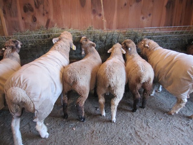 Every feeding the lambs line up at the rack together…awfully cute, eh? Maggie and Lily’s mother, Della, is to the left of Griffin. Quite often the lambs will be flanked by one or the other of the mothers at the hay feeder. Now that we are fully into off-pasture feedings I need to get coats on those lambs to protect the fleeces. That’s always entertaining when they first sport their new duds!