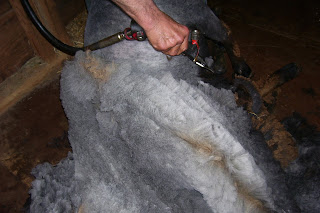 Here’s the shearer, David Hinman, getting set up, for the first time. Yes, the first time. You see, it was like this. David brought out the first ewe to shear and we were all set, everyone in their places. We had Steve, our farm helper, ready to put coats on after shearing. Jack was sweeper(cleaning the floor between each shear) and to help Steve. I was taking the shorn fleeces away, labeling and putting them in a safe area during the process. And our friend Sandy was there to watch and enjoy. And then the lights started flickering. David was shearing away and said “what’s up with your lights?” and I said “Oh s***”. We lose power in Westmoreland on the average of once a week. But the lights kept flickering only, dim, bright, dim, bright. My toes were crossed. No please dear Lord, not now, NOT TODAY! And then, dead. No lights, no power, no shearing. The first ewe was half sheared and here we were at 10:15AM!