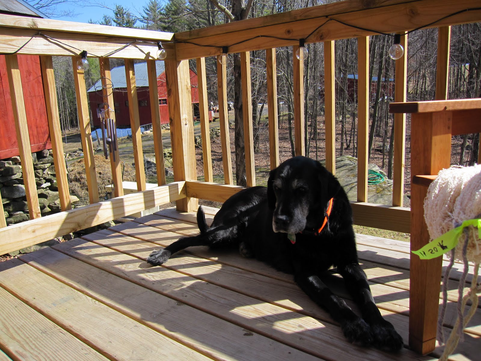 And here is Sidney…this afternoon on the deck, getting some of that peace and quiet Ed thought he should have!! You can see some of the lambing group in the background.