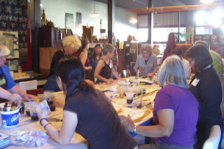 I thought I could get number of photos out tonight but it is just too darn late and tomorrow is the final push to the finish. We did an incredible amount of work. Fifteen of us focused on handpainting a number of substrates with varying degrees of texture and complexity. I took pictures but then the light was bad or the camera’s abilities were lacking OR the operator was just too busy!
