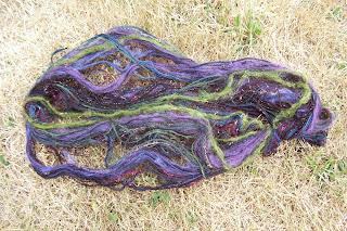 Tonight I am still immersed in thoughts of where I need to go tomorrow with final indigo tweaking and a bit of glitz still left to apply. It was definitly a week of new learning for me! Here was my free for all skein put together with various small lots of yarns overdyed in indigo…this was comic but rewarding relief today!