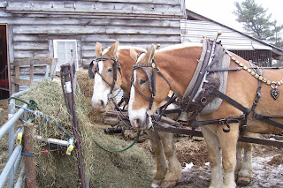 Last summer I did a post in August about Reggie who had driven his team of draft horses past our farm as he was working on a logging project not too far away. Saturday morning I was out in the workshop and Reggie drove by and we had a visit, roadside style. He said he was giving sugaring a go for the first time from beginning to end, with his team of horses helping by doing the lugging. He invited us down in the afternoon. By the time we got there he and Norm had already gathered the sap with the horses so we got to hang out, have a few beers (pretty much a given) and see what might come of the days gathering.