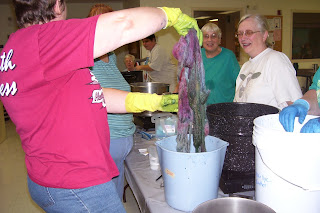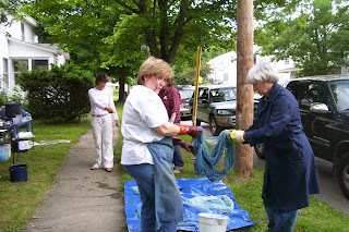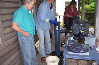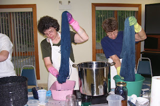 Last Saturday I traveled to CT to teach the Yankee Fiber Friends guild how to dye with indigo. There were 12 participants, a fantastic pot luck lunch, torrential rains, thunder and lightning, lots of laughter and some fabulous blues! Indigo blues, that is. Thank you one and all!