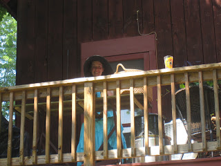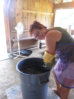 the heat beat on yesterday and Katie tried to beat the heat on the studio deck doing some skeining yarns….great hat!