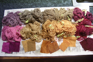These are 5 dye tests cooling after dyeing. Left to right: Cochineal, Chestnut, Cutch, Fustic and Lac.