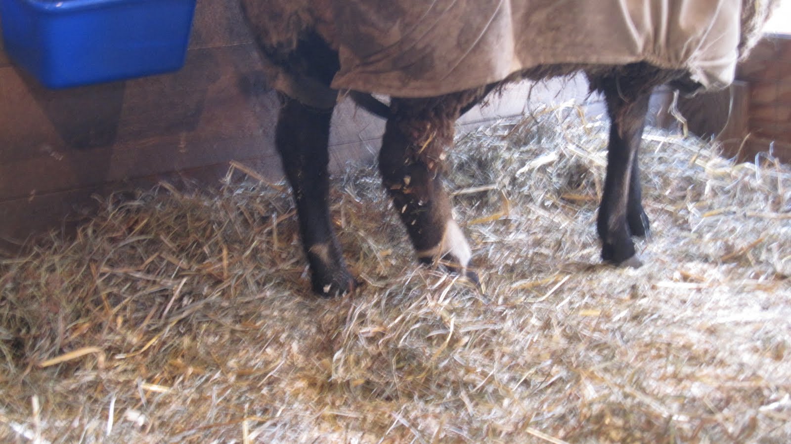 Peach’s injury has me concerned. After confining her and Crystal Tuesday to the big barn for an unforeseen period I hoped that giving her an anti-inflammatory and “hay rest” would start the healing process. But by Friday morning she was no better. As you can see, she held her right rear leg up off the floor and hobbled on the other three legs to get about. There is a limited course for the drugs to be safely given before other problematic symptoms might set in so I felt a vet visit was in order. The doc was here by 10AM. She checked every possible issue, as we had before. The leg is just so darn swollen above the fetlock.